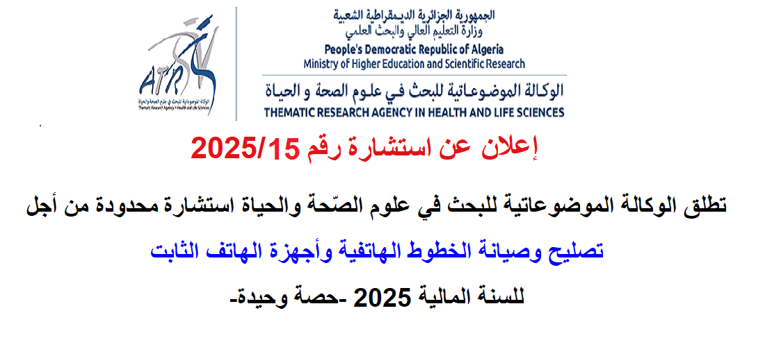 تنظم المديرية العامة للبحث العلمي والتطوير التكنولوجي بالتنسيق مع كل من الوكالة الموضوعاتية للبحث في العلوم والتكنولوجيا والوكالة الموضوعاتية للبحث في الصحة والحياة ندوة عن طريق تقنية التحاضر عن بعد حول الاعلان الثالث للمشاريع الوطنية للبحث 2023 ، لفائدة حاملي المشاريع مستقبلا